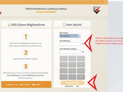 Kamu Sertifikasyon Merkezi web sitesine (https://kamusm.bilgem.tubitak.gov.tr/) girdikten sonra resimlerdeki adımları takip ederek yeni pin kodu oluşturma işlemini gerçekleştirebilirsiniz.